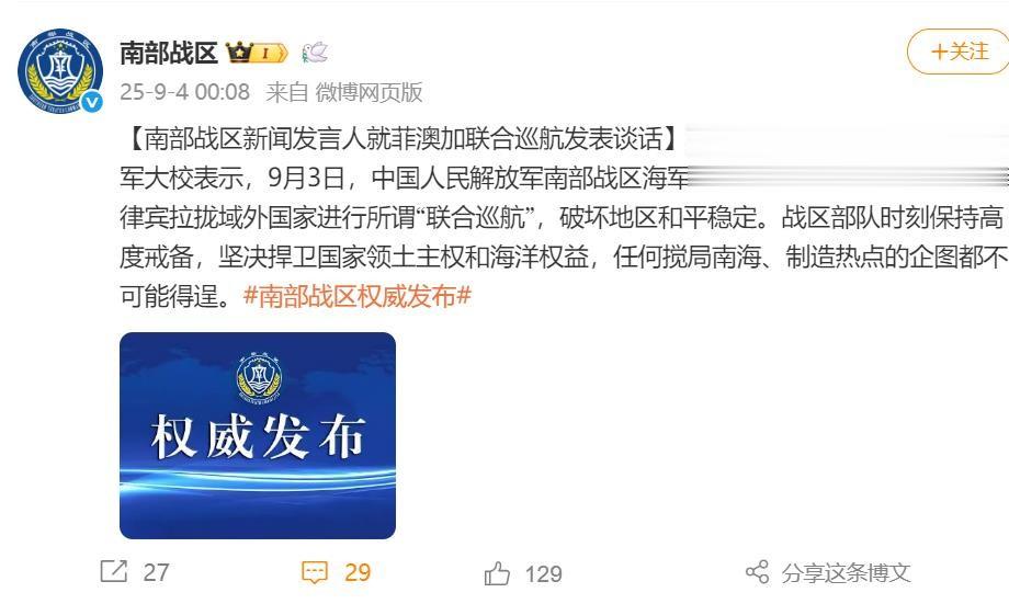 南部战区新闻发言人田军里大校于9月4日表态,战区部队于3日在南海进行了例行巡航。菲律宾拉拢域外国家进行所谓联合巡航,破坏地区和平稳定,中国军队始终保持高度戒备,坚决捍卫国家主权和海洋权益。解放军没有被情绪左右,更没有被挑衅带节奏,而是用冷静而坚决的态度表明立场。对比之下,菲律宾的动作越发显得小家子气。