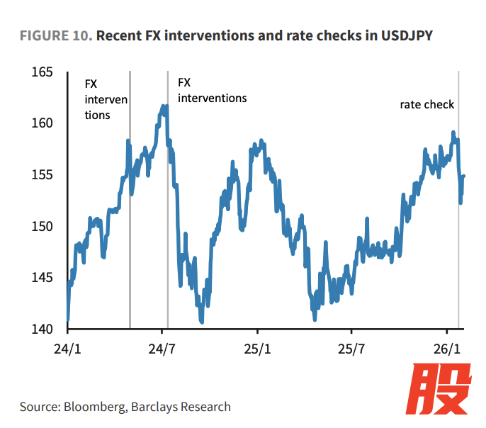 从外汇市场来看,日元下行面临多重约束。尽管选举结果可能引发日元短期走弱,但进一步贬值空间有限。巴克莱认为,美元兑日元汇率在150高位区间将面临明显阻力。关键干预警戒水平包括:日本当局此前进行汇率检查的159、重要心理关口160,以及2024年高点162。从基本面看,巴克莱模型测算美元兑日元的公允价值位于140区间高位,但考虑到“高市溢价”的短期影响,预计汇率在150附近将获得支撑,形成近期波动区间的下沿。